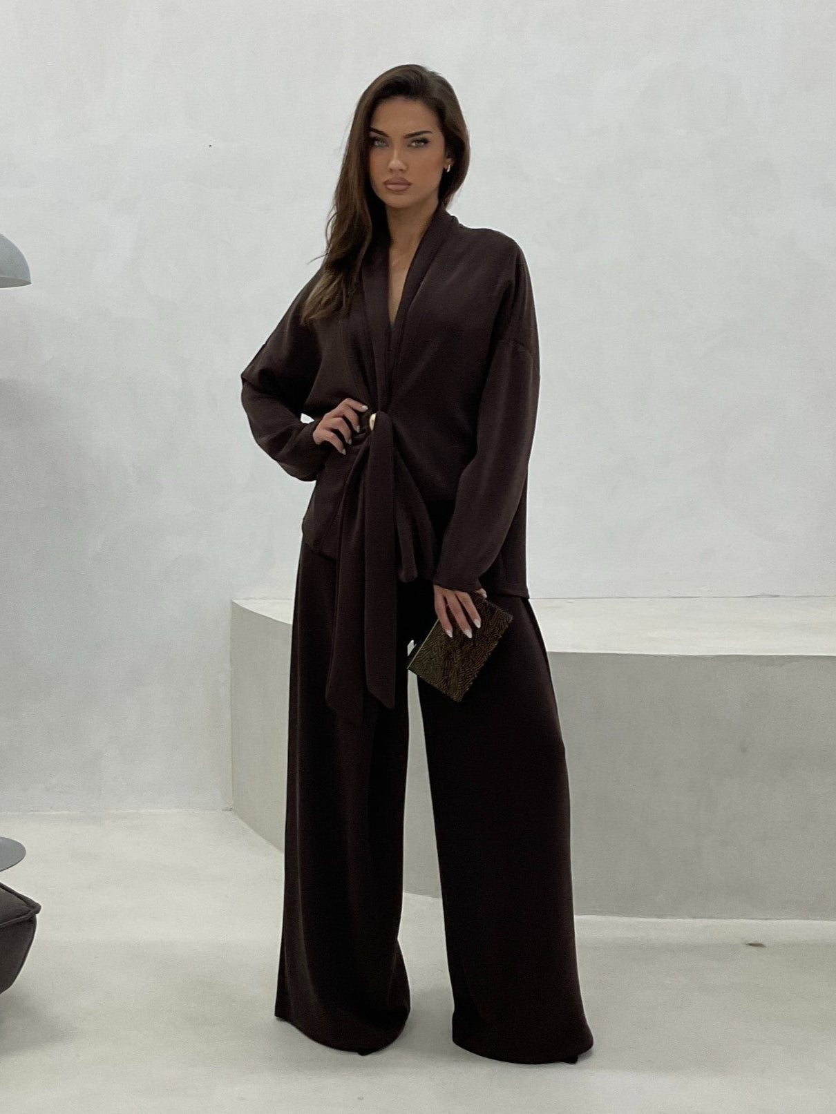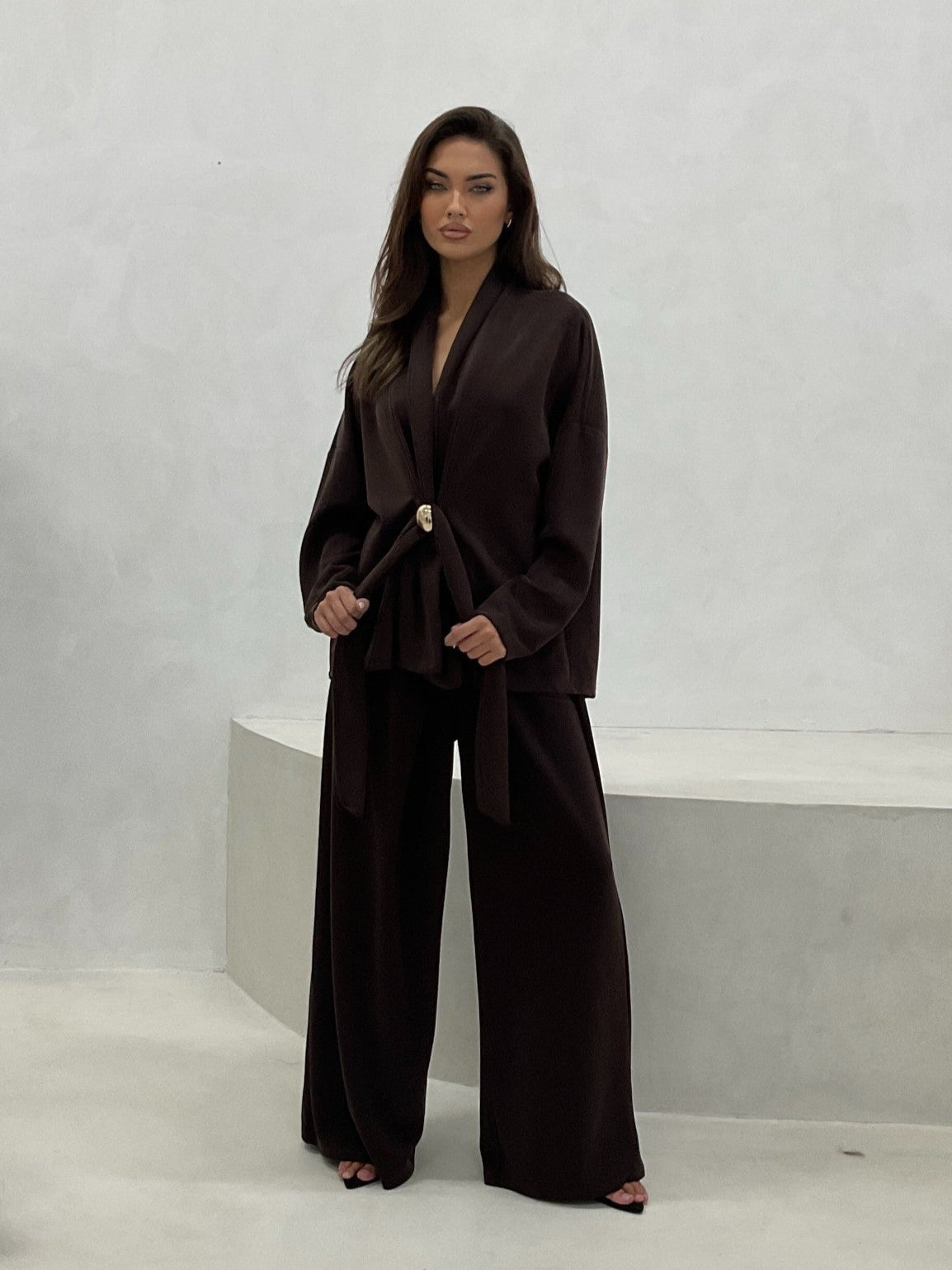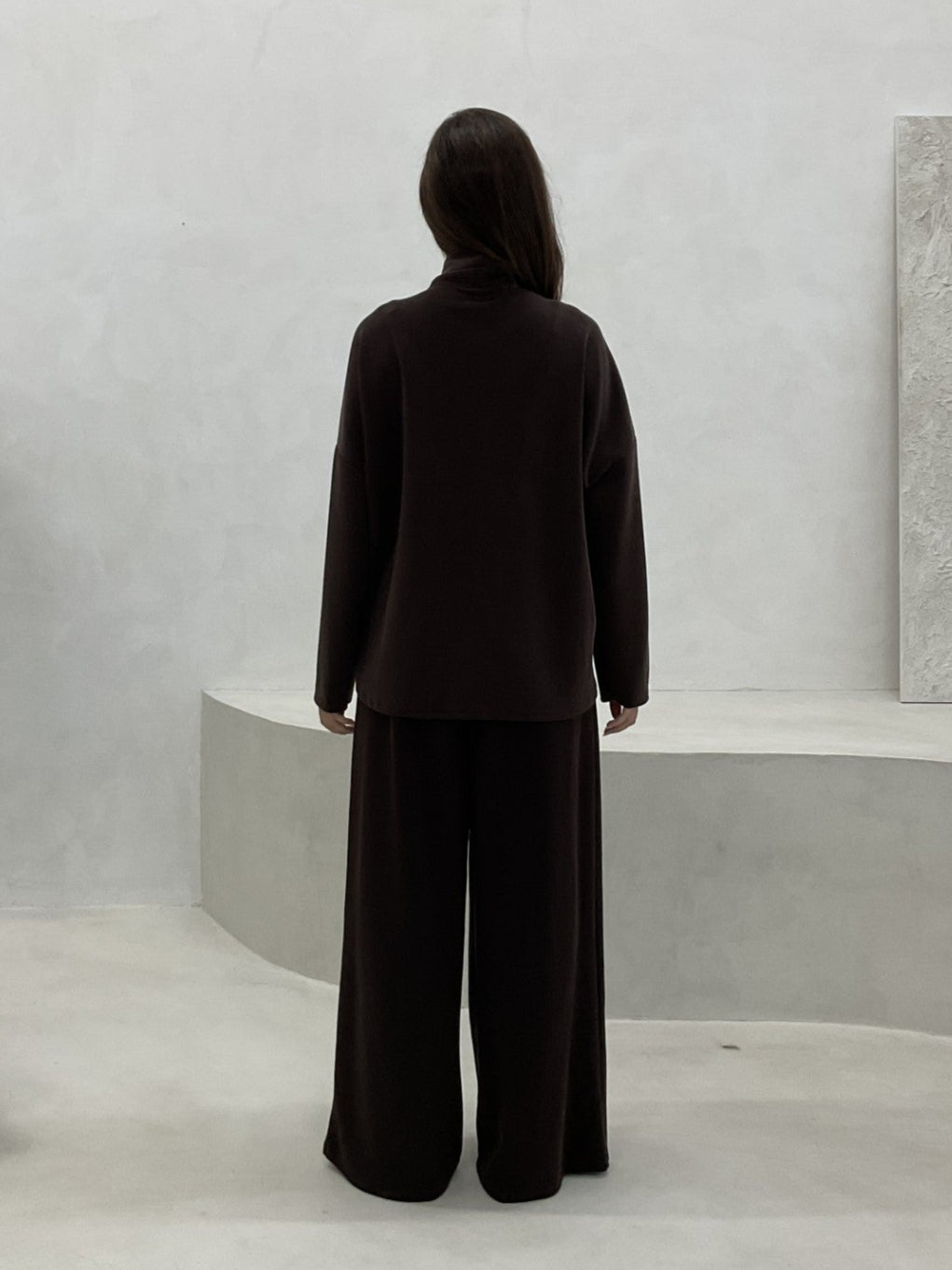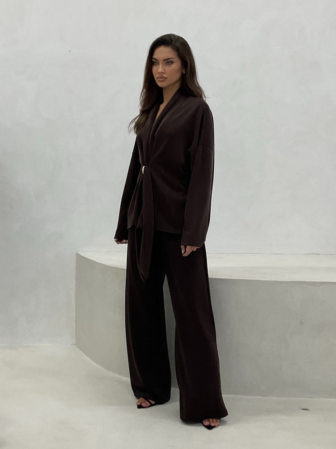 Make a statement with this luxurious chocolate brown co-ord. Perfect for colder days, with thick, soft material. Elasticated waist trousers