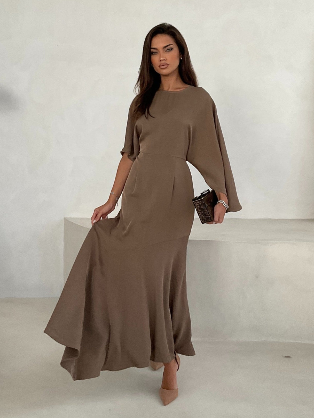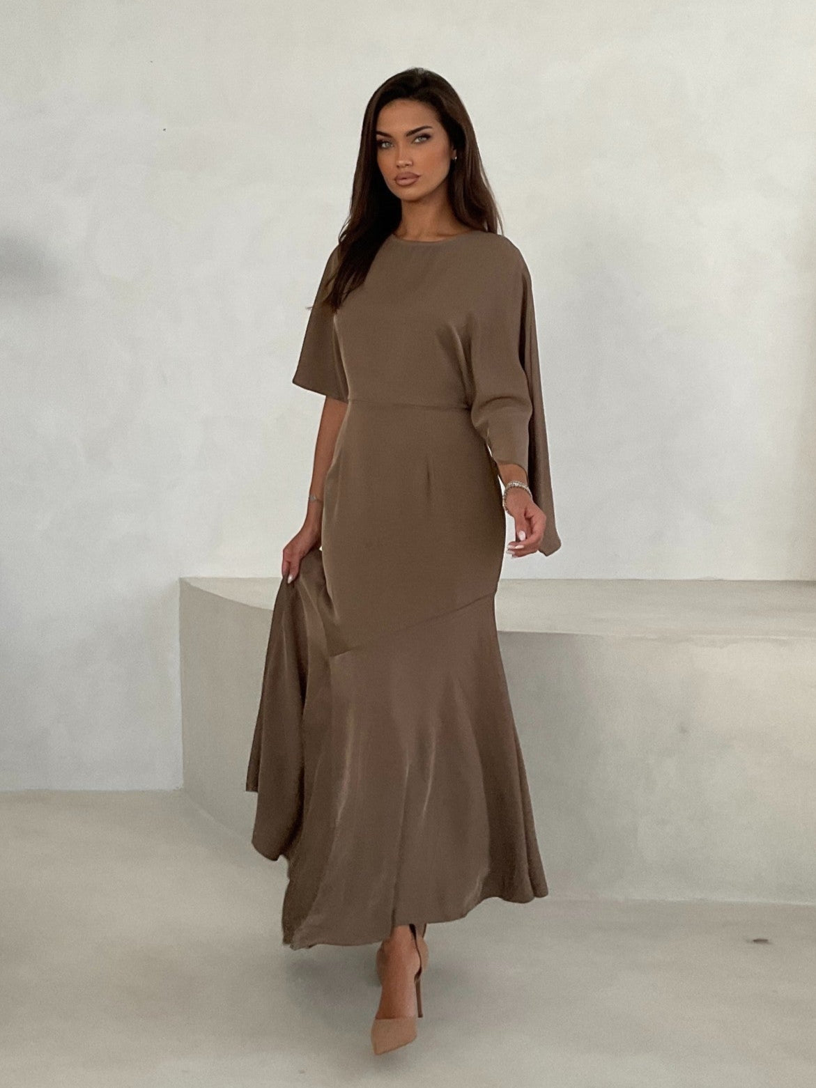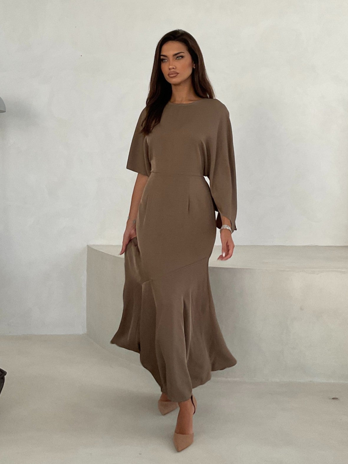 • Premium textured fabric • V-neckline for a flattering silhouette • Relaxed batwing sleeves for added comfort • Unique fringe detailing at the hem • Form-fitting design accentuating your curves • Maxi length for an elegant finish