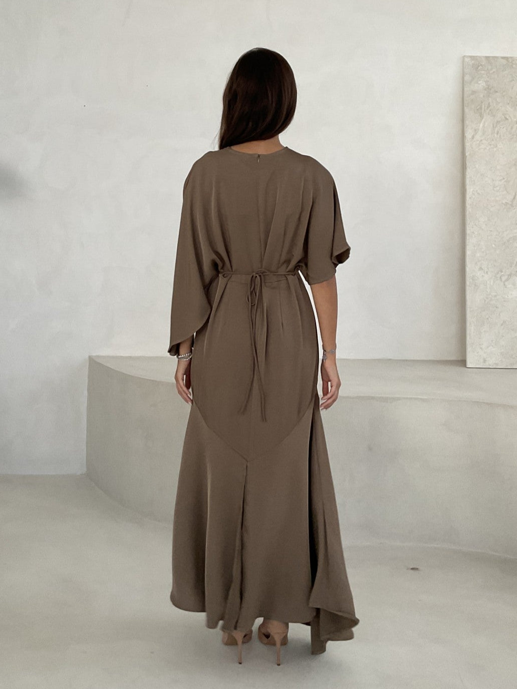 Exude timeless elegance with this camel tie-waist dress, featuring asymmetric sleeves.