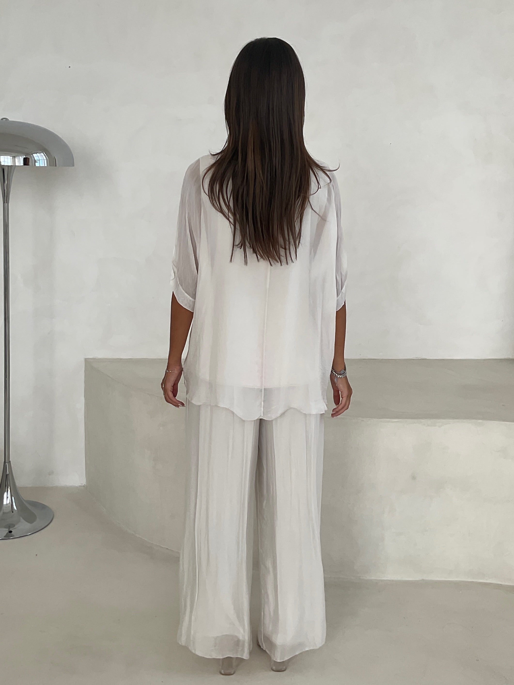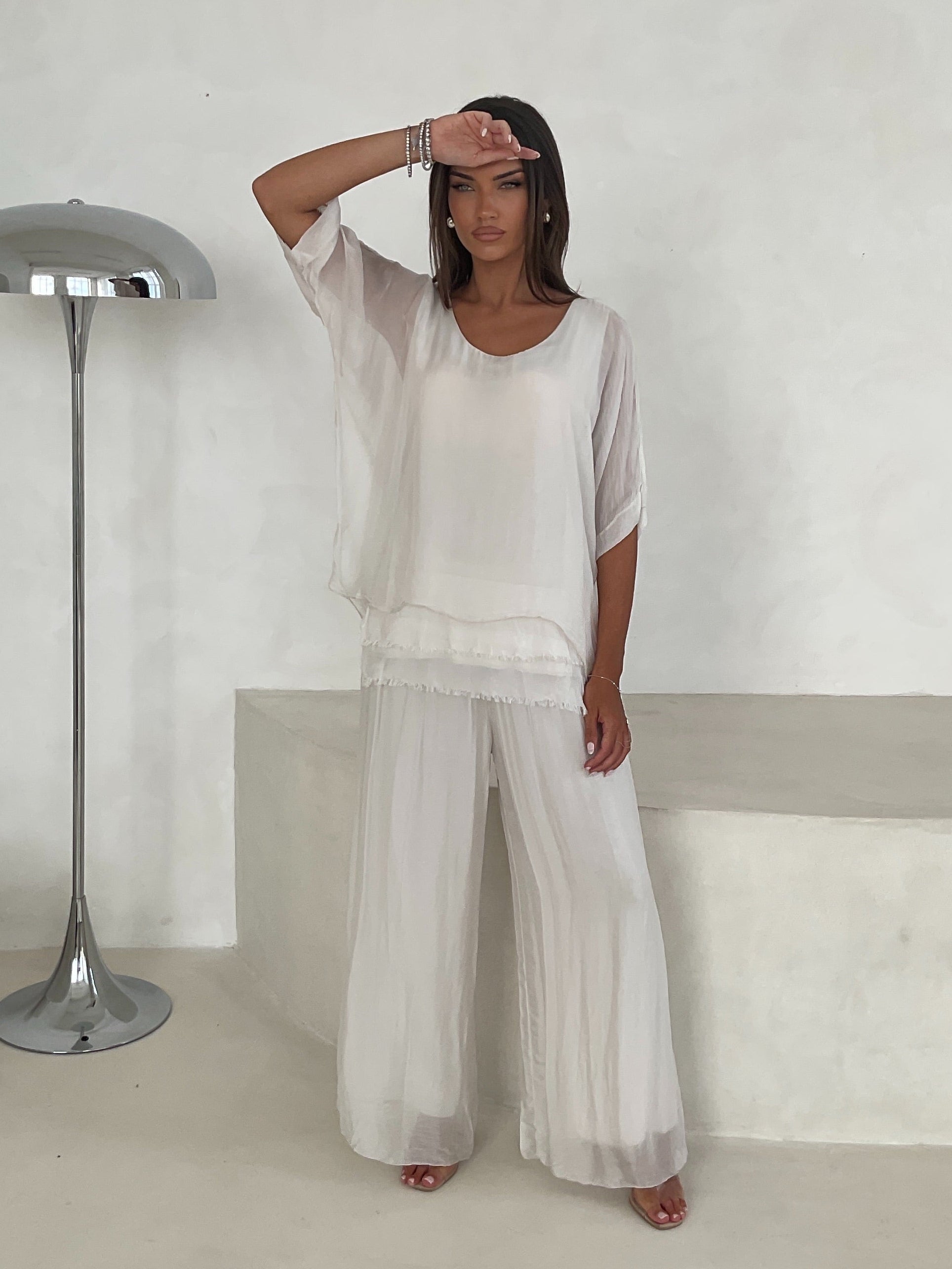 The perfect co-ord to take you from day to evening. Featuring a frill detailed silky, floaty top and matching wide-leg trousers.