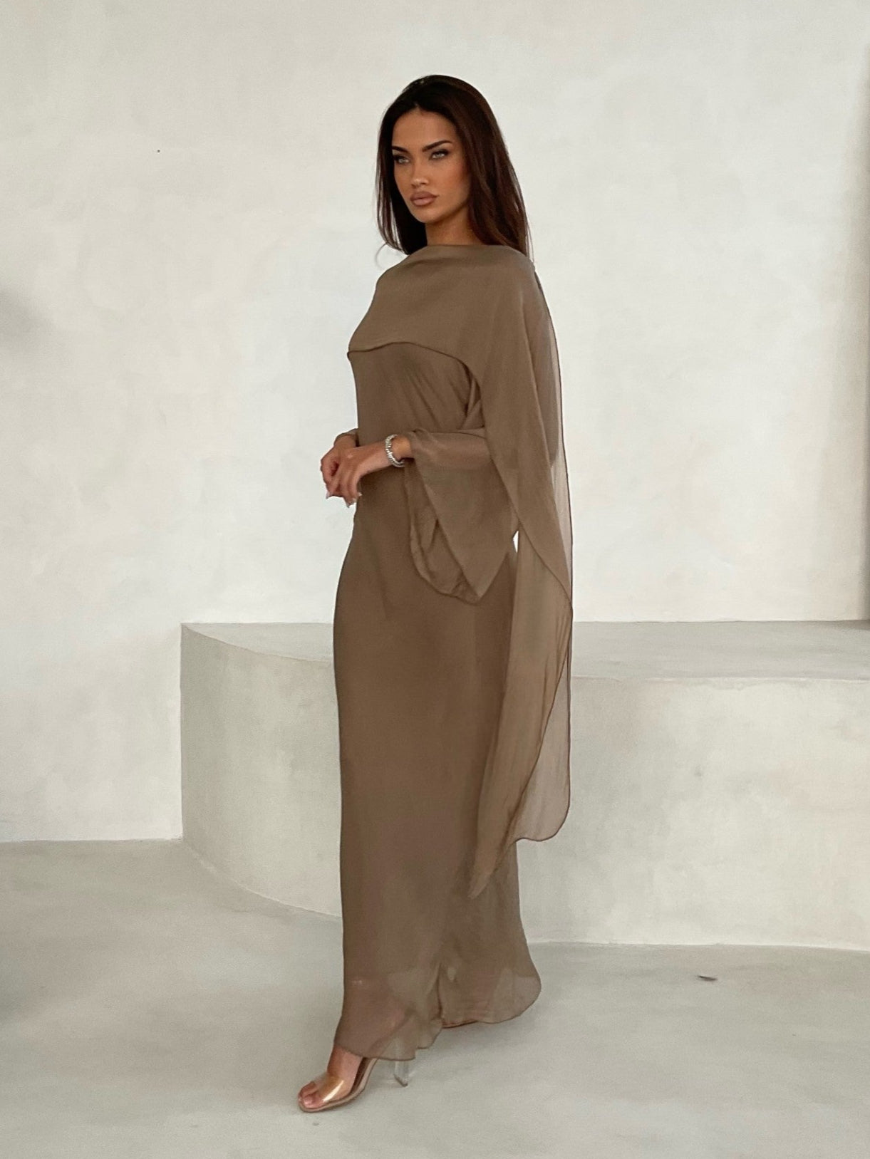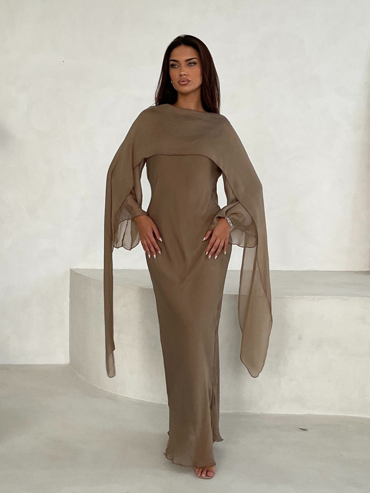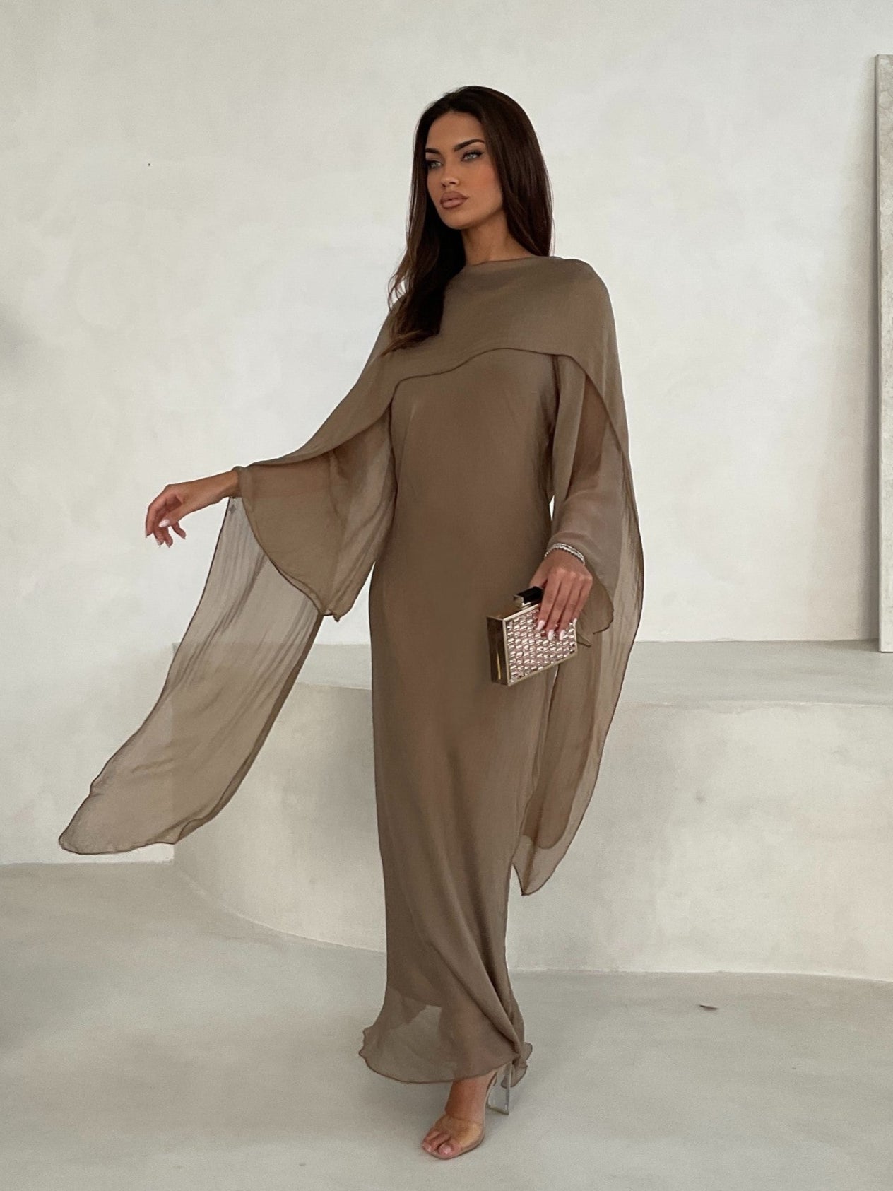 • Premium textured fabric • V-neckline for a flattering silhouette • Relaxed batwing sleeves for added comfort • Unique fringe detailing at the hem • Form-fitting design accentuating your curves • Maxi length for an elegant finish
