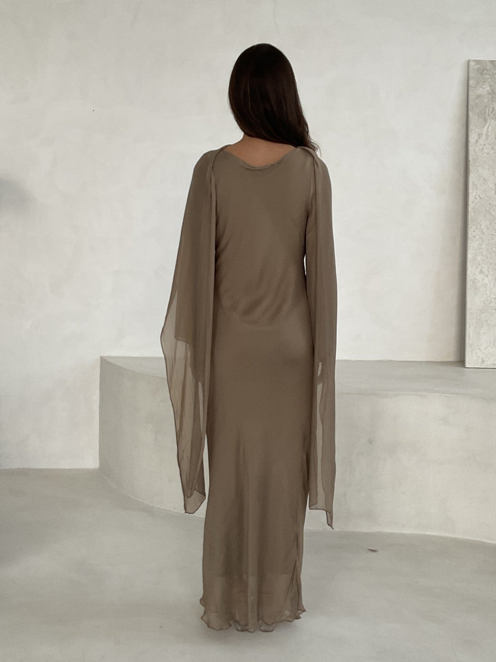 Make a statement with this floaty, silk maxi dress. Perfect for formal gatherings or a sophisticated evening out, this dress combines traditional elegance with contemporary style. Scarf attached.