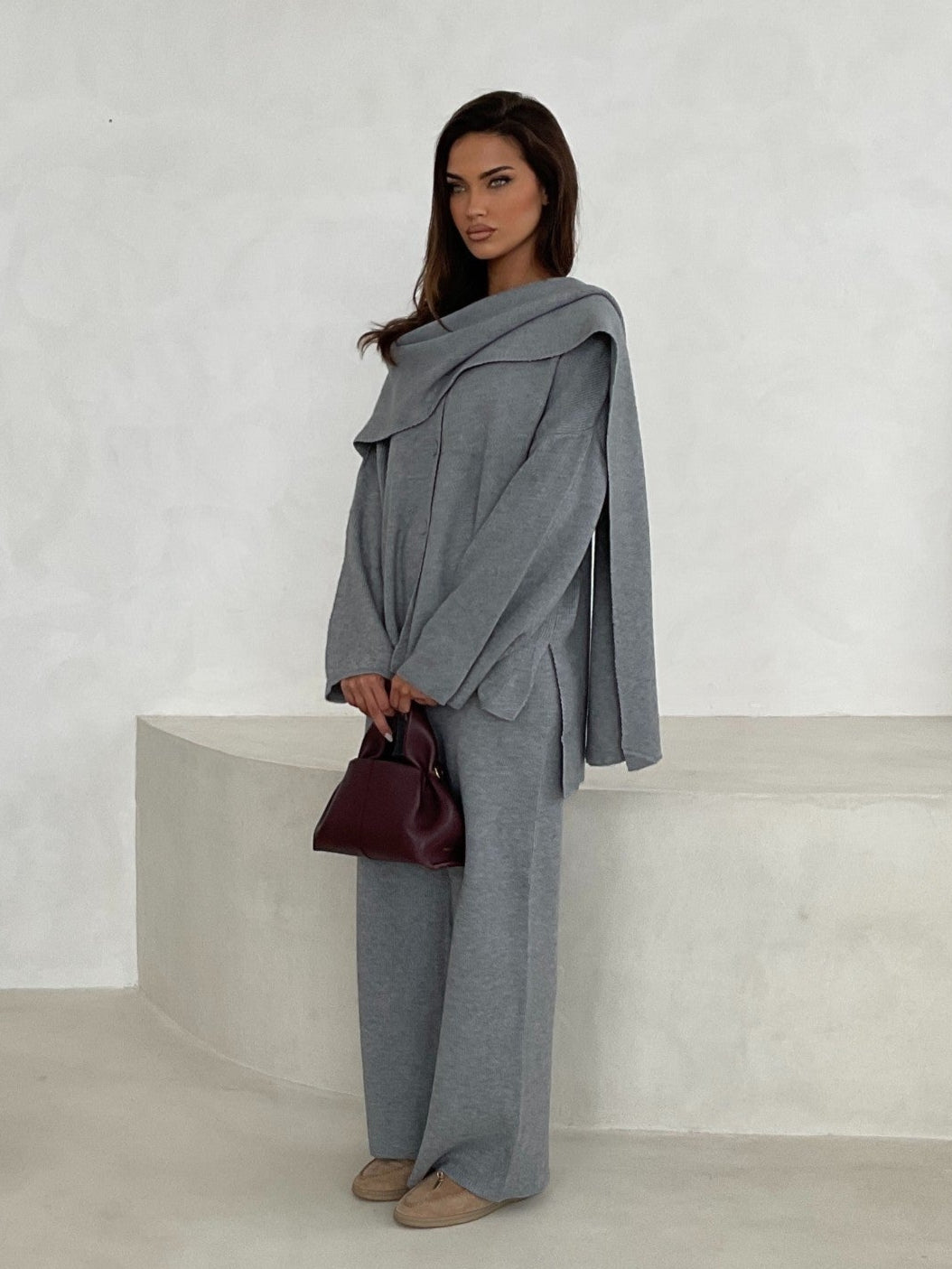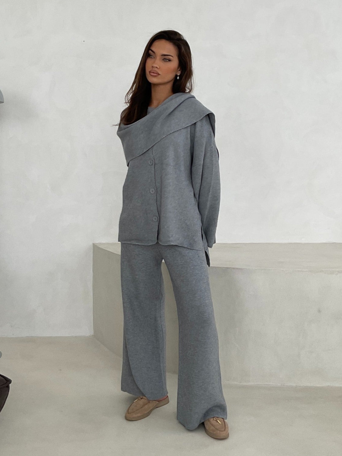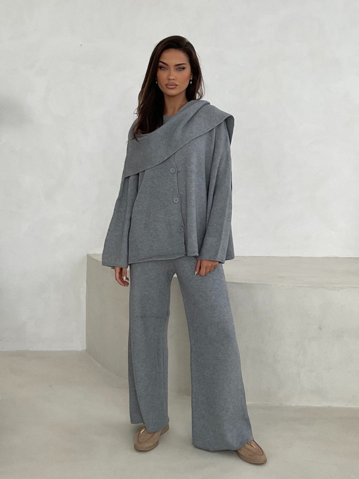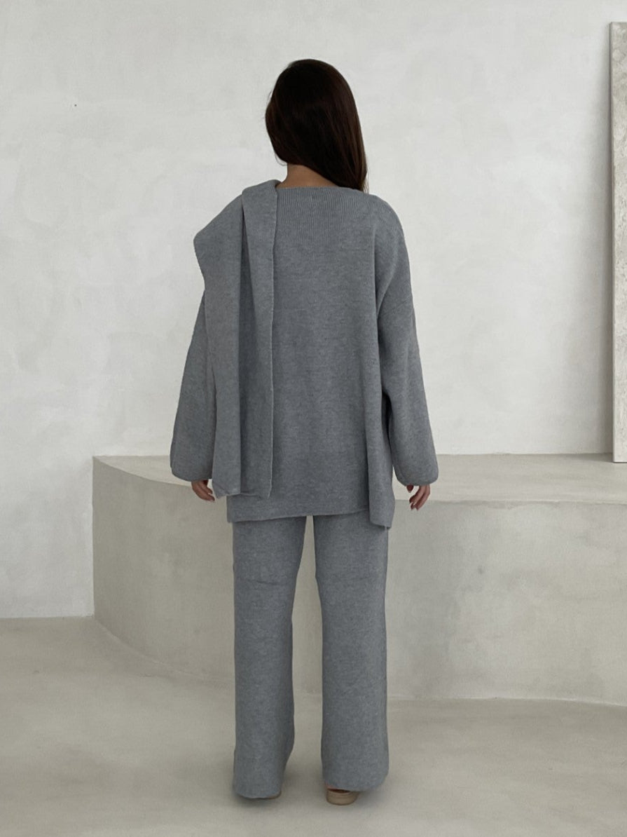 Step into casual elegance with this grey, knit two-piece set. Featuring an attached scarf and front button with a matching pair of wide-leg trousers, this outfit is perfect for both relaxed and stylish occasions.
