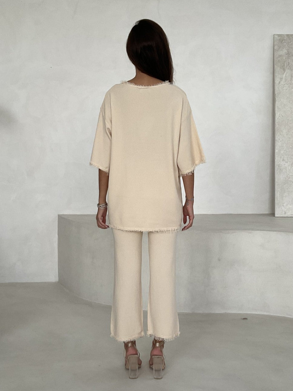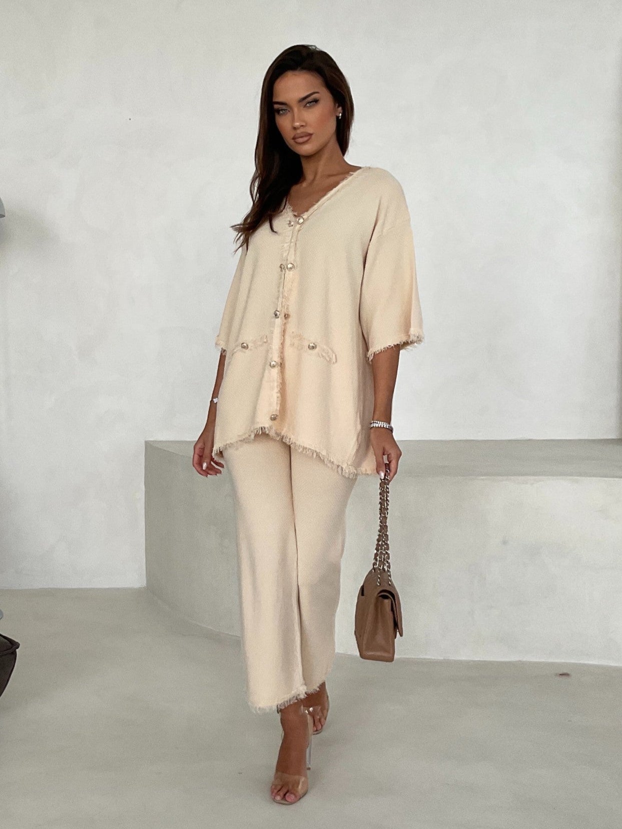 Embrace elegance with this stunning cream co-ord. This two-piece ensemble features gold buttons with matching elasticated waist trousers.